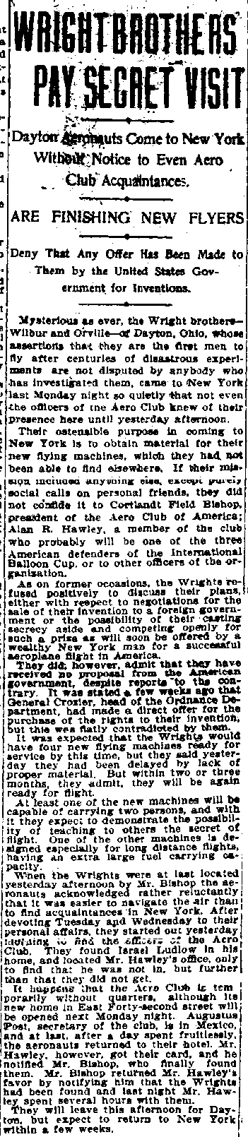 Dayton Aeronauts Come to New York Without Notice to Even Aero Club Acquaintances - Are finishing new Flyers - Deny that an offer hs been made to them by the United States Governement for Inventions.