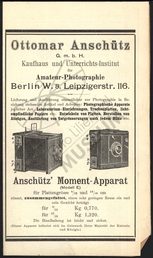 "Anschütz' Moment-Apparat", beworben durch "Ottomar Anschütz g. m. b. H. Kaufhaus und Unterrichts-Institut für Amateur-Photografie"