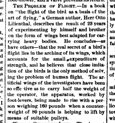 "In a book on "the flight of the bird as a basis of the art of flying," a German author, Herr Otto Lilienthal, describes the result of 23 years of experimenting by himself and brother on the form of wings best adapted for carrying heavy bodies. He concludes—as have others—that the real secret of a bird's flight lies in the arching of its wings, which accounts for the small expenditure of strength, and he believes that close imitation of the birds is the only method of solving the problem of human flight. The artificial wings of the investigators have been so effective as to carry half the weight of the operator, the apparatus, worked by foot-levers, being made to rise with a person weighing 160 pounds when a counterweight of 80 pounds is helping to lift by means of suitable pulleys."