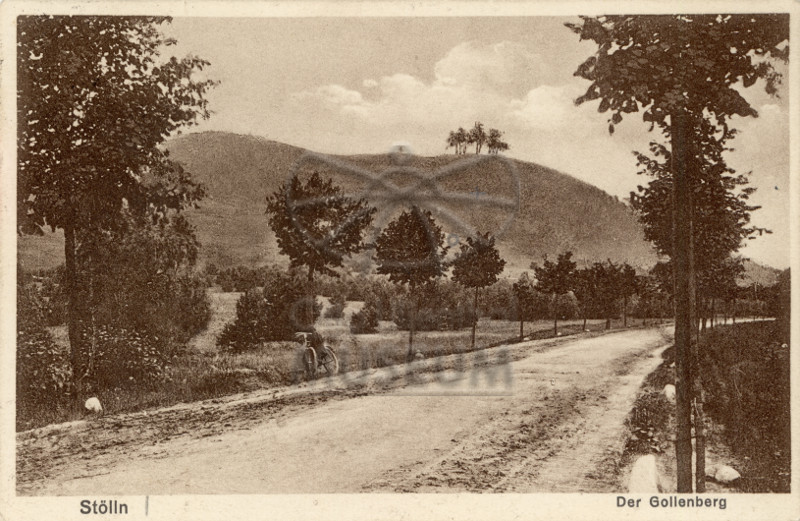Ansichtskarte (Lichtdruck) "Stölln.Der Gollenberg" an Paul Beylich von den Kopfermanns: "Herzlichen Gruß von historischer Stätte senden nach gelungener Radfahrt Ihre Kopfermanns. x= Abflugstelle"