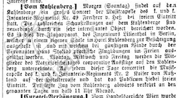 unter "Wiener Tages-Bericht. Wien, 22. September. "Die zahlreichen Schausstellungen auf dem Kahlenberge sind neuerdings durch ein sehr interessantes Object bereichert worden. Es ist dies der Flugapparat des Ingenieurs Lilienthal in Berlin, welcher in einem eigenen Saale in Hotel Kahlenberg zur Besichtigung ausgestellt ist und mit welchem bei günstigem Winde durch den Aëronauten Hans Stoklas practische Flugübungen in Freien ausgeführt werden."