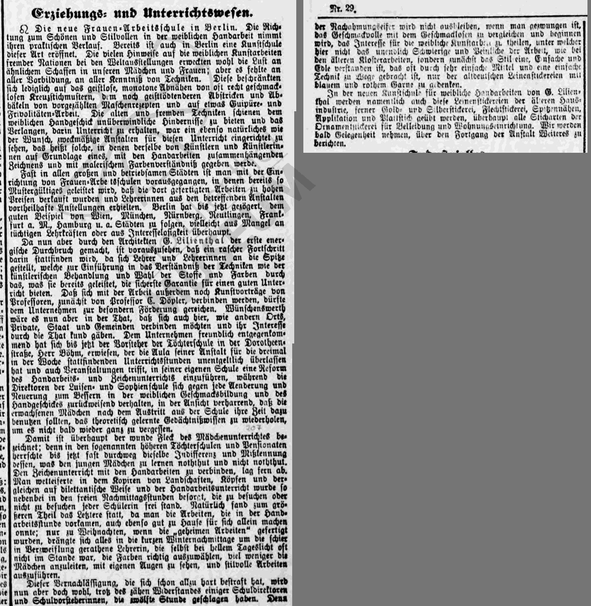 "... Da nun aber durch den Architekten G. Lilienthal der erste energische Durchbruch gemacht, ist vorauszusehen, daß ein rascher Fortschritt darin stattfinden wird, da sich Lehrer und Lehrerinnen an die Spitze gestellt, welche zur Einführung in das Verständniß der Techniken wie der künstlerischen Behandlung und Wahl der Stoffe und Farben durch das, was sie bereits geleistet, die sicherste Garantie für einen guten Unterricht bieten. ..."