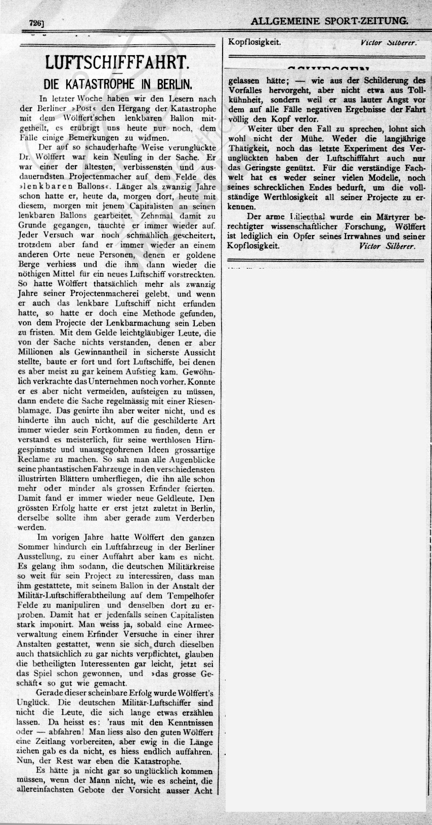 zum Absturz des Wölfertschen [hier Wölffert] Ballons unter Erwähnung von Lilienthal