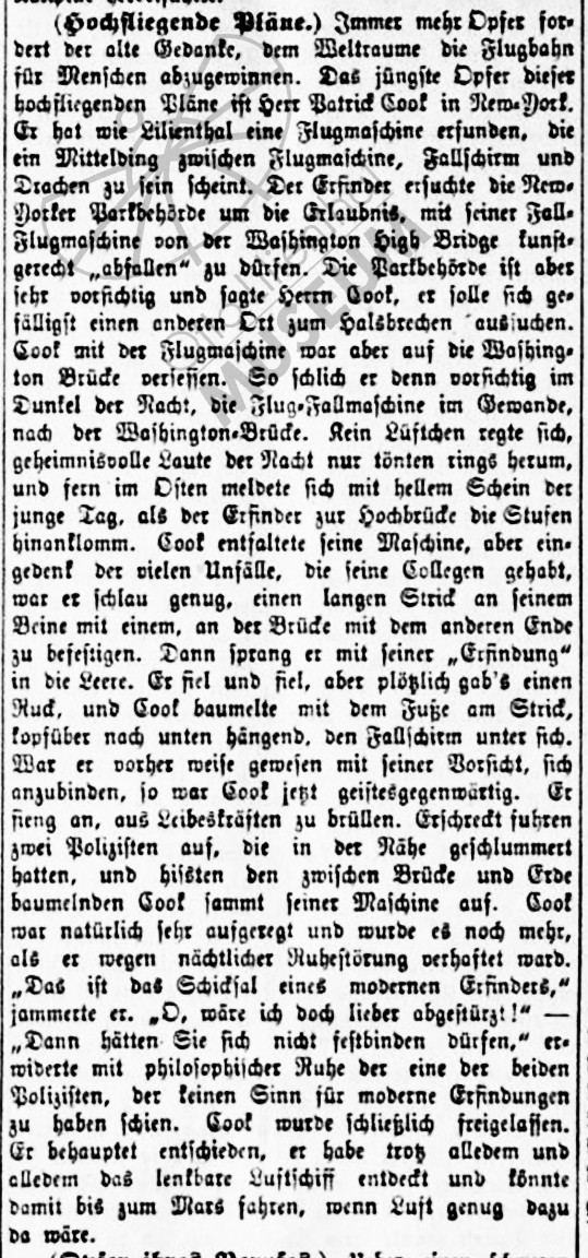 über den gescheiterten Versuch von Patrick Cook, mit dem von ihm erfundenen Gleitflugapparat von der Washington-Bridge zu starten. Es wird auf Lilienthal verwiesen.
