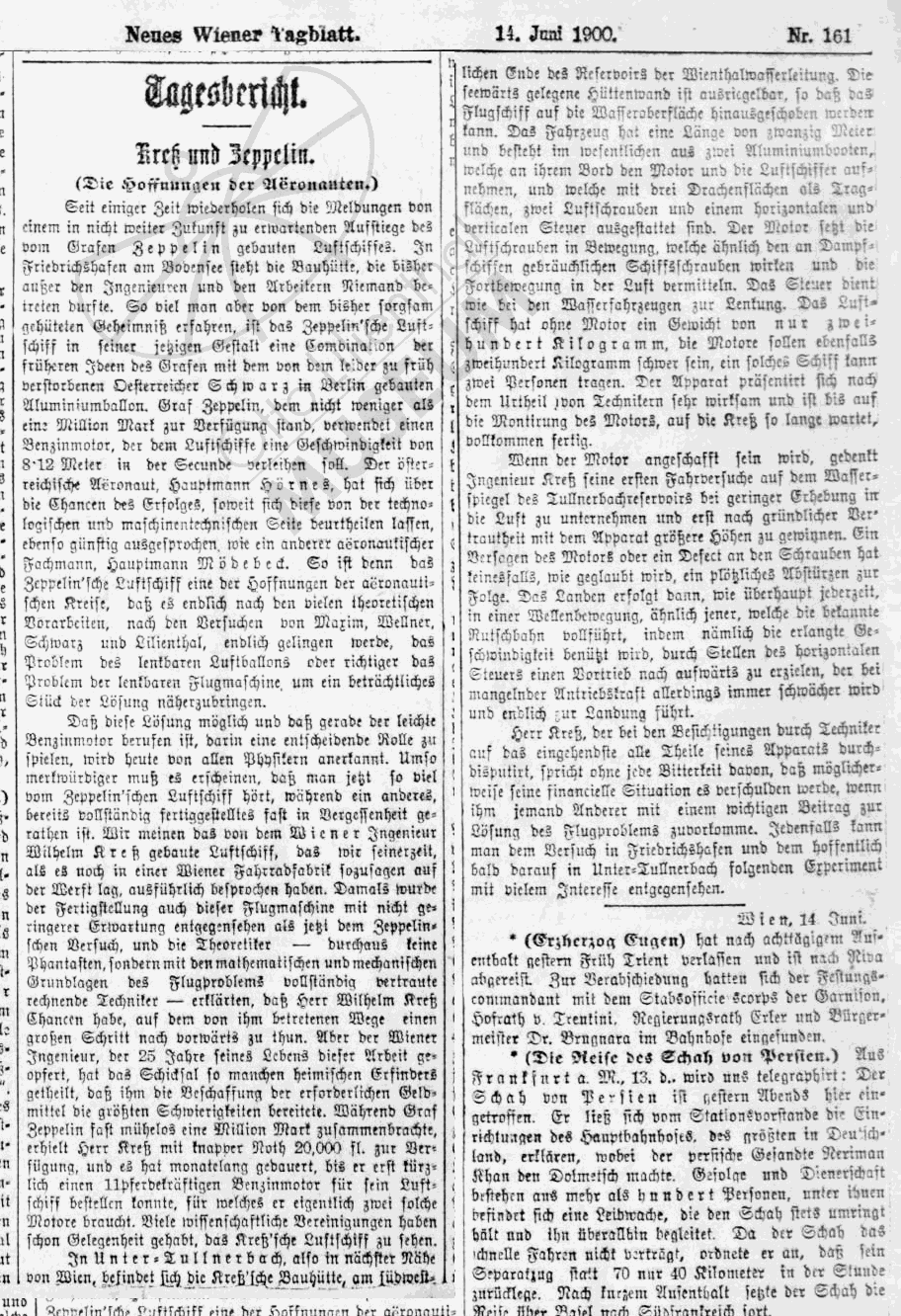 "Herr Kreß [...] spricht ohne Bitterkeit davon, daß möglicherweise seine financielle Situation es verschulden werde, wenn ihm jemand Anderer mit einem wichtigen Beitrag zur Lösung des Flugproblems zuvorkomme. Jedenfalls kann man dem Versuch in Friedrichshafen und dem hoffentlich bald darauf in Unter-Tullnerbach folgenden Experiment mit vielem Interesse entgegensehen."