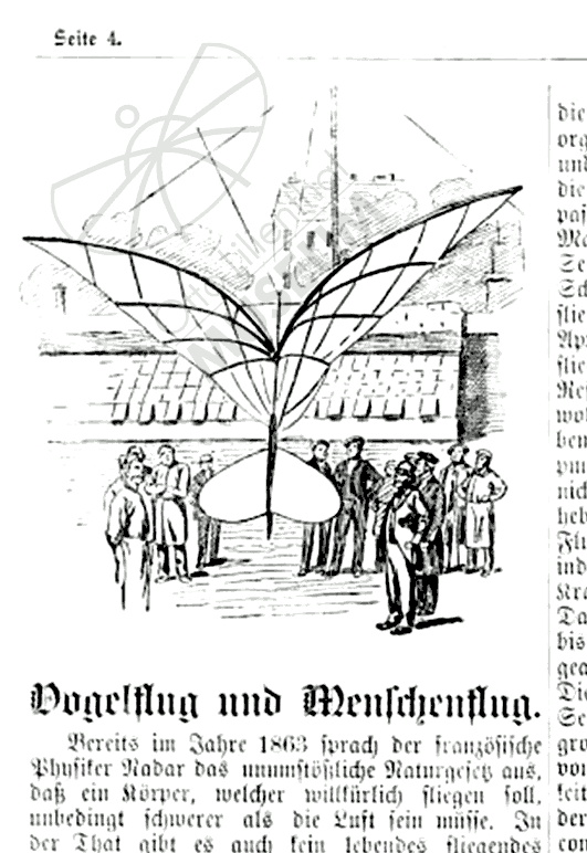 Über den durch den Autor gebauten, durch Kohlensäuremotor angetriebenen Schlagflügel-Apparat. referiert Lilienthal ohne auf dessen Versuche mit Kohlensäuremotor eizugehen.
