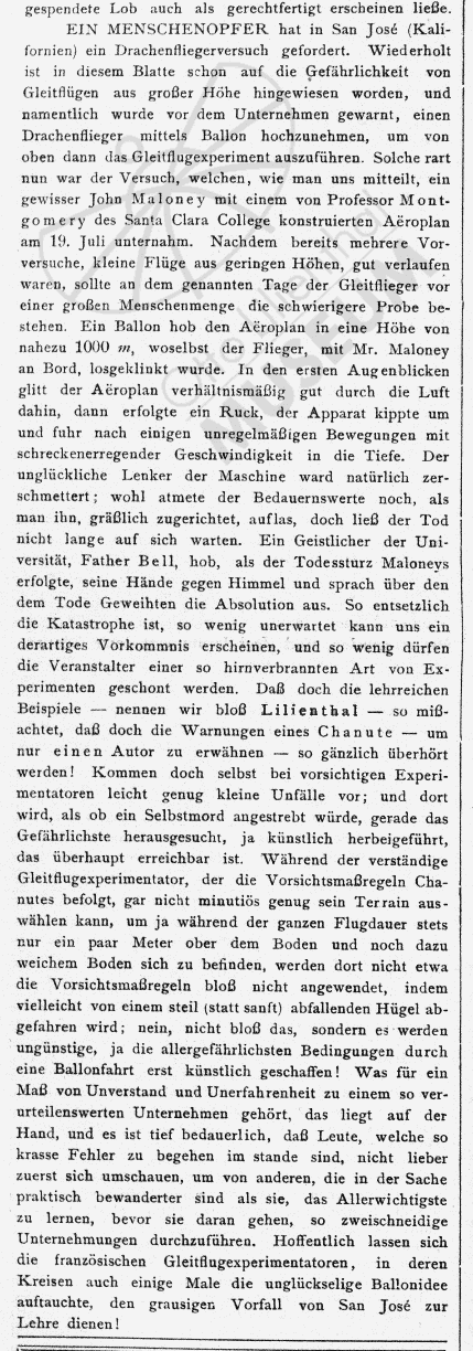 zum tödlichen Unfall von John Maloney mit Montgomery-Gleiter, mit dem er vom ballon aus startete