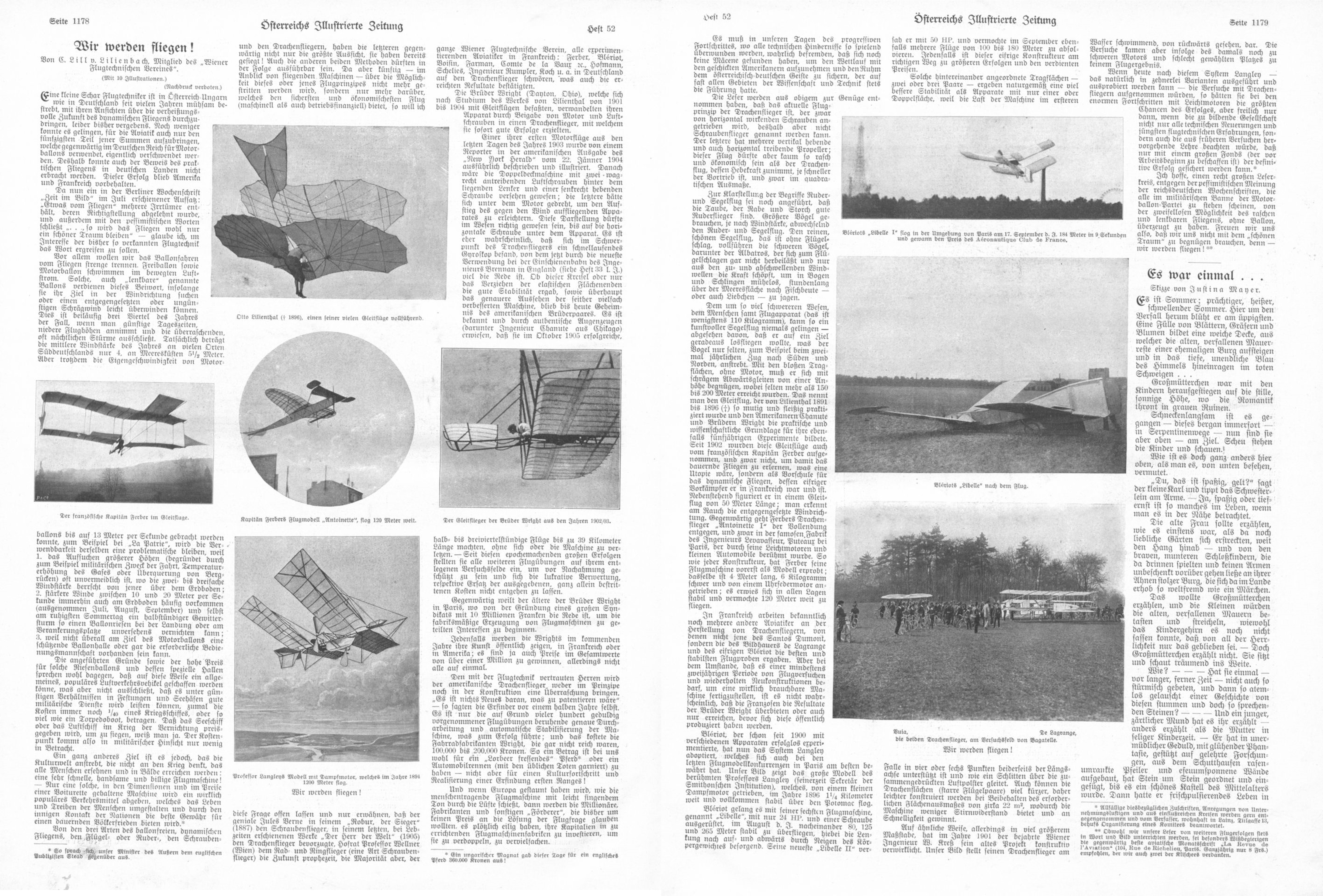 mit Fotogrfien: Lilienthal, Ferber, Langley, Wright, Bleriot, Vuia, de Lagrange. "entgegen der pessimistischen Meinung der reichsdeutschen Wochenschriften, die alle im militärischen Banne der Motorballon-Partei zu stehen scheinen, von der zweifellosen Möglichkeit des raschen und und lenkbaren Fliegens, ohne Ballon, überzeugt zu haben."