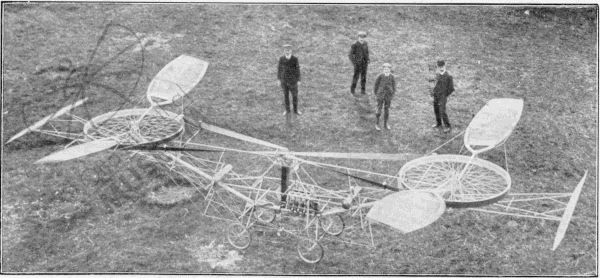 Das Grundgestell des aus Stahlrohren gefertigten Apparates ist ein V-förmig geknicktes Hauptrohr, an dessen Enden sich die beiden Rotoren befinden. Es ist mit einem Rahmen verbunden, der Motor, Platz für Besatzung und auch 4 pneumatisch bereifte Fahrwerksräder aufnimmt. Der Apparat ist 6,2 m lang. Er wiegt mit Führer 260 kg. Die zweiflügeligen Schrauben sind mit fahrradähnlichen Rädern so verbunden, daß man ihre Steigung verändern kann. Die Schraubenblätter bestehen aus einem flachgedrückten Stahlrohr mit einer mittleren und vier dazu senkrechten Querrippen, deren äußerste versteift ist. Sie sind mit gummierter Seide überzogen und gerade so steif, daß sie in Ruhelage ihre Form bewahren. Eingenähte Bleigewichte halten sie bei der Rotation durch Fliehkraft in der richtigen Lage. Jede ist 1,8 m lang und 0,9 m breit. Der Antrieb erfolgt über einen 22 m langen und 10 cm breiten Riemen, der über Leitrollen zum 24 PS-Antoinette-Motor führt und durch sein Gleiten Schwierigkeiten bereitete. Unter den Rotoren befinden sich zwei Flächen von 2,5 m Länge und 0,6 m Breite. Diese Stoßflächen sind um eine quer zur Flugrichtung liegenden Achse drehbar und verschieden zu neigen. Bei 50 - 60 Grad Neigung liegt der Vortrieb bei 2/3 des Auftriebs, ohne mehr als 1/3 der Motorkraft in Anspruch zu nehmen. Schraubensteigung 3 m, 85 U/min bei 850 U/min des Motors. Ende 1907 mit 2 Personen bei 330 kg auf 1,5 m gestiegen, Schwebe in 1 m Höhe.
