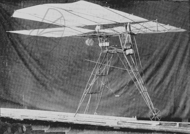 Mehr Erfolg als mit seinem starren Vieldeckermodell hatte Hofmann mit Modellen, deren Flügel gefaltet waren. Dieser "Drache [...] wurde mit hochstehenden Beinen auf ein kleines, nicht ganz tischhohes Gerüst gestellt, so dass ich eben noch unter den Flügeln aufrecht Platz hatte. Es sei hierbei bemerkt, dass die Beine des Modells ca. 1m lang sind; es klaftert 2,6 m und ist von Spitze Flügeldreieck bis Hinterkante Steuer 2 m lang und über 3,5 kg schwer. Zeigte nun das Manometer" (vergl. Abb.) "zwischen Dampfdom und Schutzgabel einen Dampfdruck von.ca. 11,5 Atmosphären [...,] so wurde der Regulator, dicht hinter dem Schornstein sichtbar, geöffnet. Der Dampf strömte dann aus dem Kessel zunächst durch die um den Schornstein gewickelte Dampftrocknerschlange, dann durch die beiden Überhitzerschlangen unten in die Feuerung und schliesslich durch das kleine, über dem dicken waagerechten Rohre liegende Röhrchen in die Verbunddampfmaschine, wo er nach hinten austrat und hierbei einen Teil der Feuergase durch das dicke Rohr mitriß, so dass Zylinder und Schteberkästen der Dampfmaschine direkt beheizbar waren. Der Propeller fing jetzt an zu laufen, und zwar mit etwa$ 35 Umdrehungen in der Sekunde."