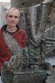 Hartmut Klopsch mit seiner Plastik: "unbemerkter Abflug" (Engelssturz hinter Flusspferd)