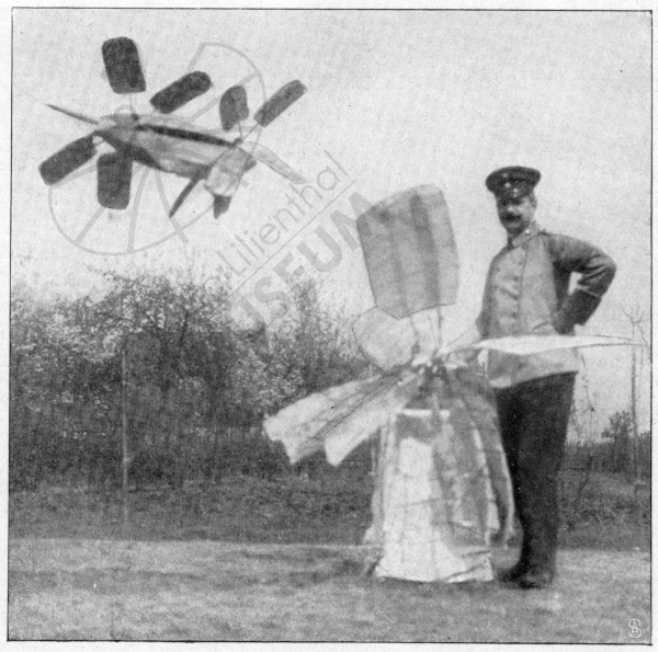 "Idee rotierender Flügel [...] Apparat hat eine gewisse Ähnlichkeit mit dem Automobil. An Stelle der Räder sind vier Flügelgruppen angebracht, die durch den im Innern befindlichen Motor in Rotation, beziehungsweise in auf- und niederschlagende Bewegungen versetzt werden. Durch Einstellung der Flügel wird der ganze Apparat gehoben, vorwärtsbewegt und je nach Einstellung der Flügel auch nach jeder beliebigen Richtung hin in der Luft gelenkt. Die Flügel sind so eingerichtet,, daß beim Flügel-Aufschlag die Luft hindurchstreifen kann. Die praktischen Versuche haben ergeben, daß die elastisch gebauten Flügel die Maschine sehr wohl vorwärts zu treiben und eine große Hubkraft zu entwickeln vermögen. Die Flügel bewegen sich derart, daß sie von oben nach vorn, von vorn nach unten, von unten nach hinten und von hinten nach oben eine Rotation ausführen. Dieser Flügelflieger wird mit zwei Personen an Bord 438 Kilogramm wiegen."