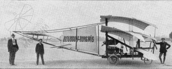 "Firmin Bousson with brothers Achille and Paul Borgnis built their first (unsuccessful) machine in 1901. The machine illustrated is the canard Auto Aviateur of 1908 powered by a 34 h.p Buchet engine, which I do not believe actually flew. I presume that the three people in the photograph are M.Bousson and the brothers Borgnis." (Quelle: https://www.aviastar.org/air/france/bousson-borgnis.php)