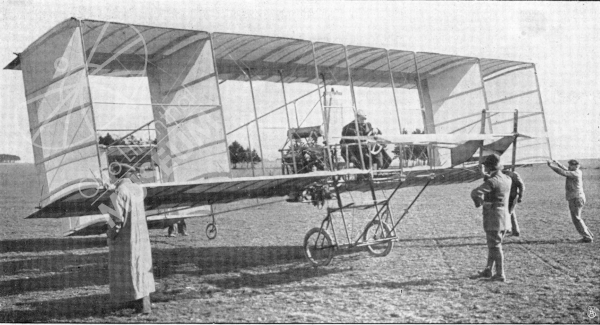 Der von den Brüdern Voisin gebaute Aeroplan des belgischen Baron de Caters, der während der Frankfurter Luftschiffahrtsausstellung erfolgreiche Flüge ausgeführt hat.