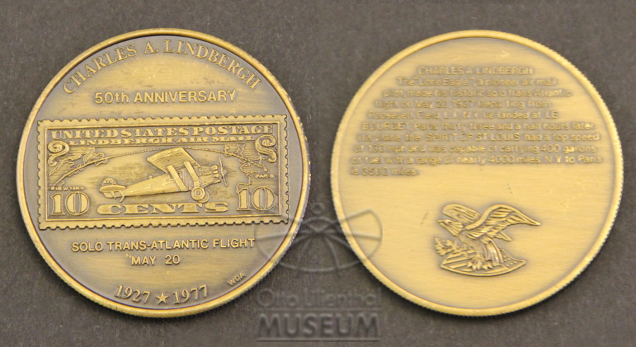RS: Motiv eines Adlers kurz vor dem Abflug, Schrift: CHARLES A. LINDBERGH. THE "LONE EAGLE", A PIONEER AIR MAIL PILOT. MADE HIS HISTORIC SOLO TRANS ATLANTIC FLIGHT ON MAY 20, 1927. DEPARTING FROM ROOSEVELT FIELD, L.I.N.Y. he landed at LE BOURGET, PARIS. THIRTY THREE AND A HALF HOURS. HIS PLANE THE SPIRIT OF ST. LOUIS HAD A TOP SPEED OF 130MPH AND WAS CAPABLE OF CARRYING of 400 GALLONS OF FUEL WITH A RANGE OF NEARLY 4000 MILES. N.Y TO PARIS IS 3500 MILES. [Charles A. Lindburgh, genannt " der einsame Adler", ein Pionier als Luftpostpilot. Vollbrachte die historisch erste Überquerung des Atlantiks, am 20. Mai 1927. Er startet vom Roosevelt Field in New York und landetet in Le Bourget in Paris. Er flog 33,5h. Sein Flugzeug, " The Spirit of St. Louis" konnte eine Höchstgeschwindigkeit von 130mph erreichen und 400 Gallonen Kraftstoff fassen. Es hatte eine Reichweite von beinahe 4000 Meilen. Von New York nach Paris sind es 3500 Meilen.]