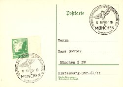 Haupstadt der Bewegung auf Postkarte, frankiert m. Postwertzeichen m. Abb. Adler und Weltkugel