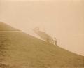 Gleitertransport hangaufwärts. Paul Beylich im Apparat, Lilienthal dahinter.